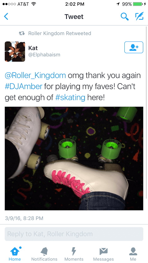 3. Give us a quick shout out on Twitter! Use the same handle @roller_kingdom to send a tweet, GIF, picture and more.