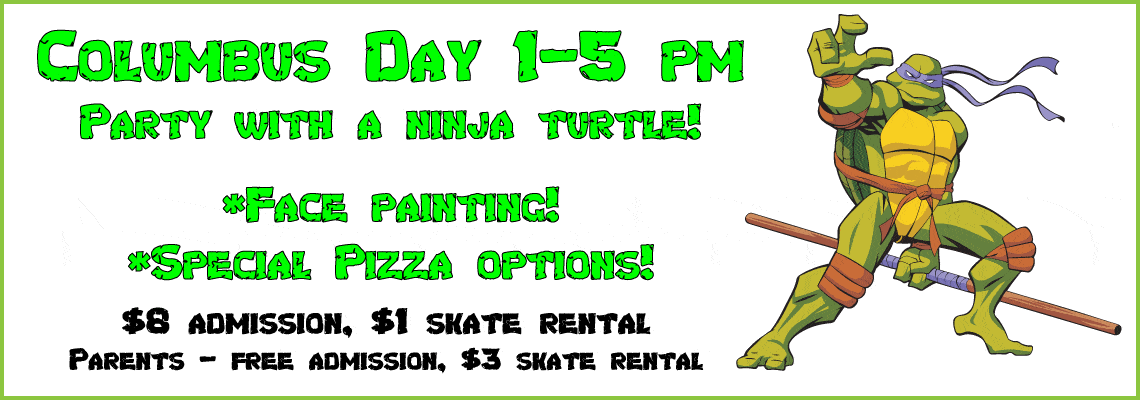 Come on out on Columbus Day and party with a Ninja Turtle! Our skate is from 1-5pm, admission is $8, and skate rental is $1 extra. Parents, you get free admission, and skate rental is $3. We can’t wait to see you out for this fun-filled skating session!